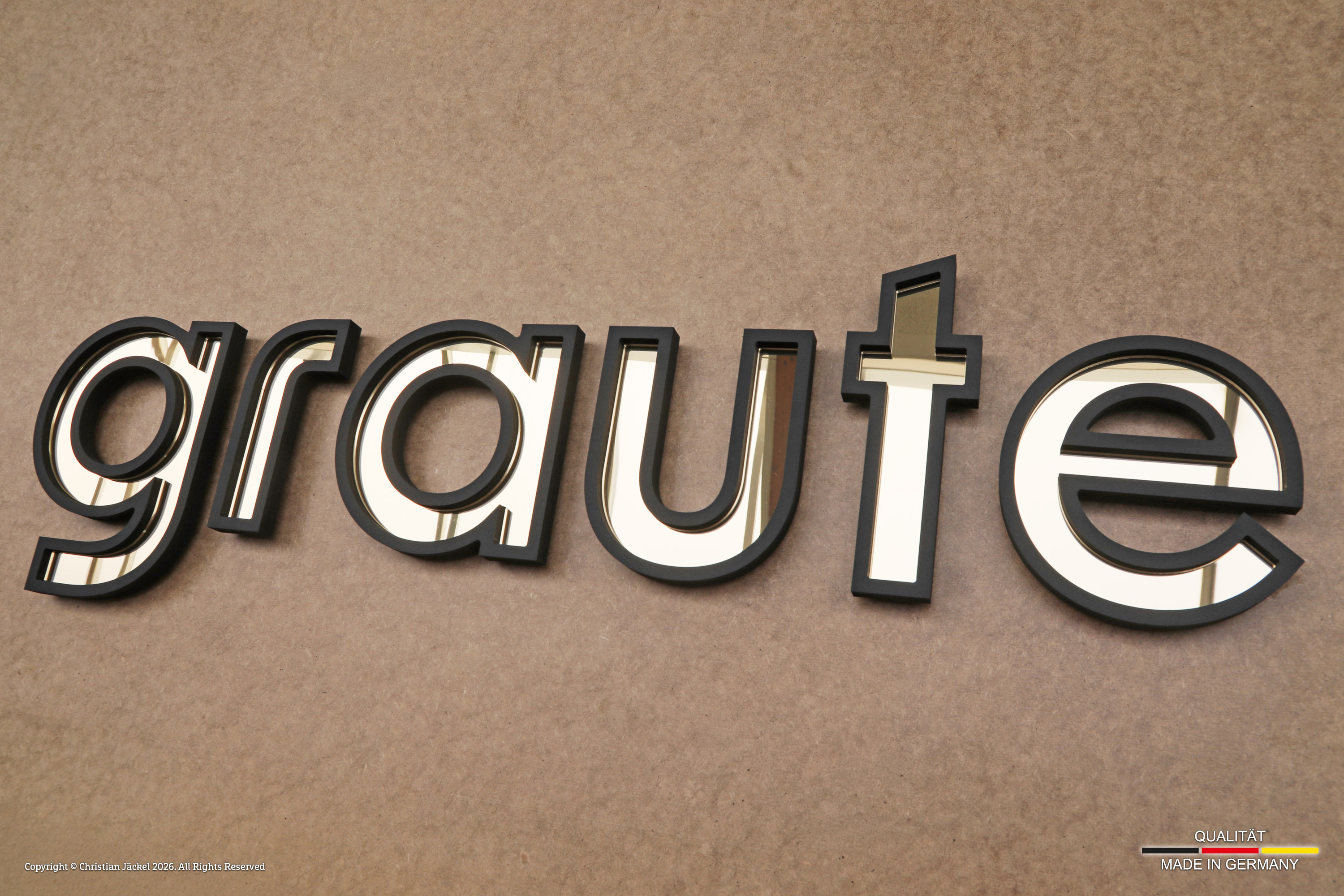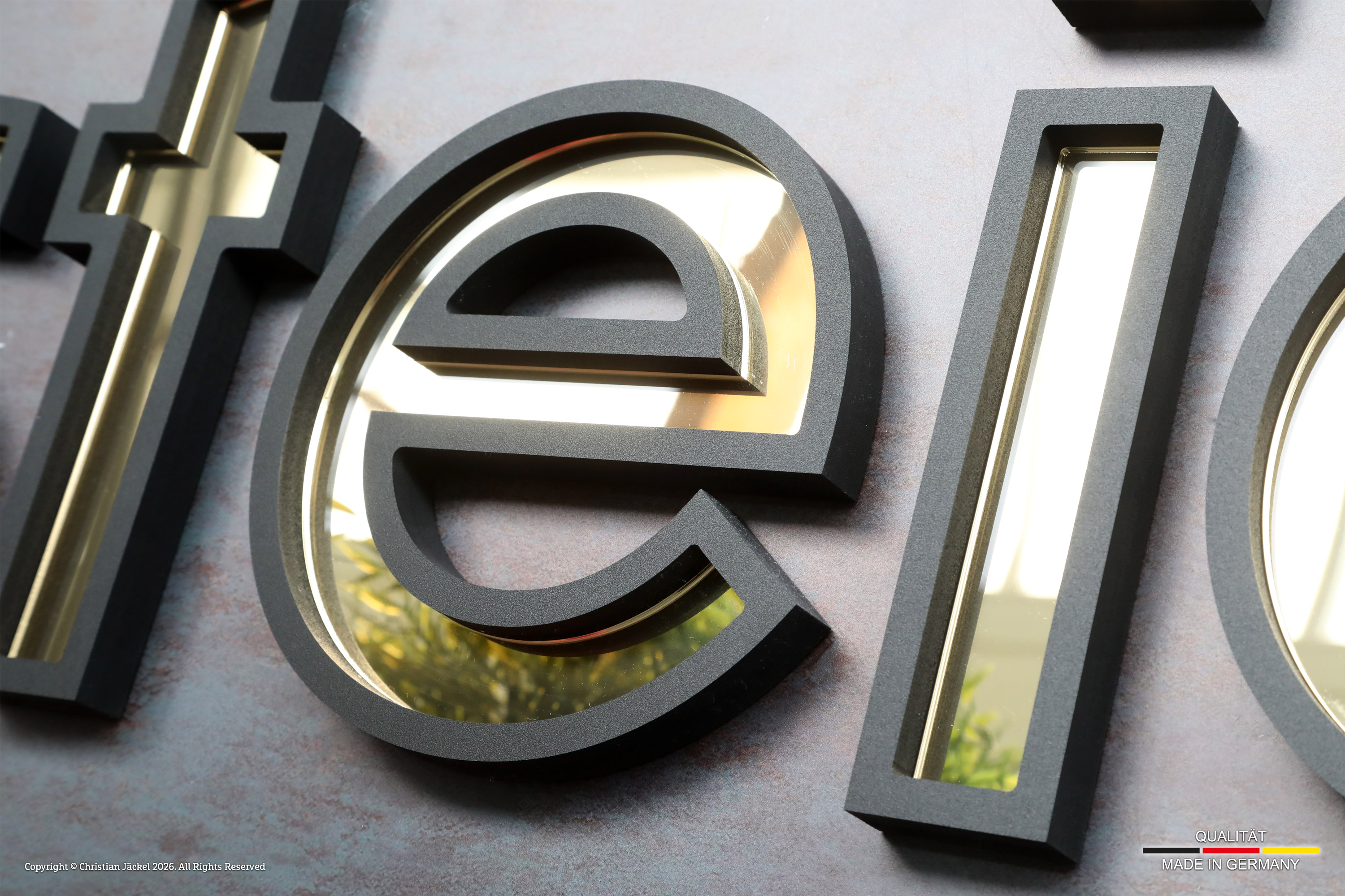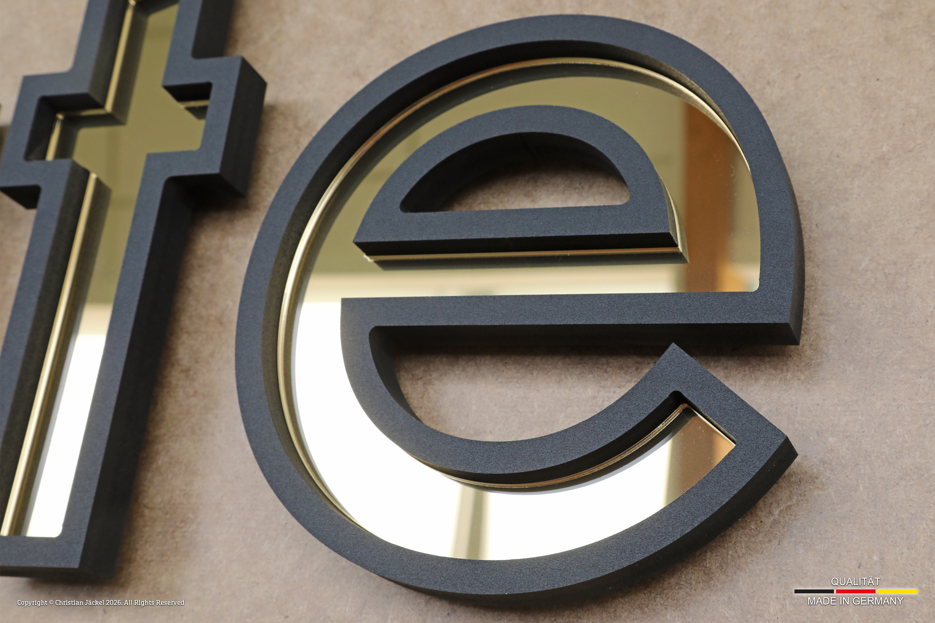 Polierte Edelstahlbuchstaben und Logos wirken immer exklusiv und haben eine hochwertige, gold-spiegelnde Oberfläche.