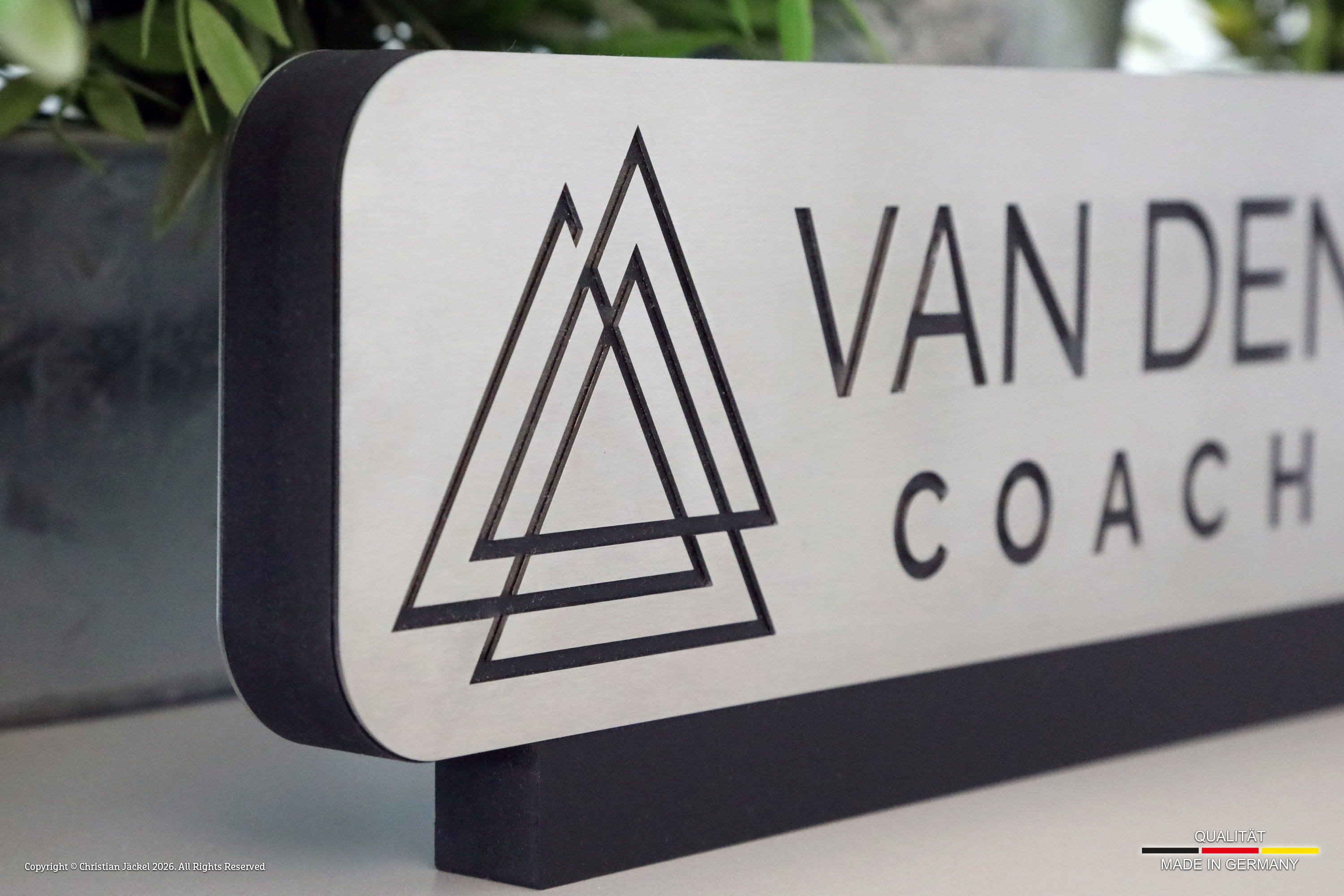 Tischaufsteller aus hochwertigem Edelstahl in 4 Varianten und einem Träger aus 19 mm Forex-Classic in weiß oder Forex-Color in schwarz. Diese Aufsteller werden in Buchstabenkontur gefräst und haben einen Sockelstreifen der die einzelnen Elemente zu einem Objekt verbindet.