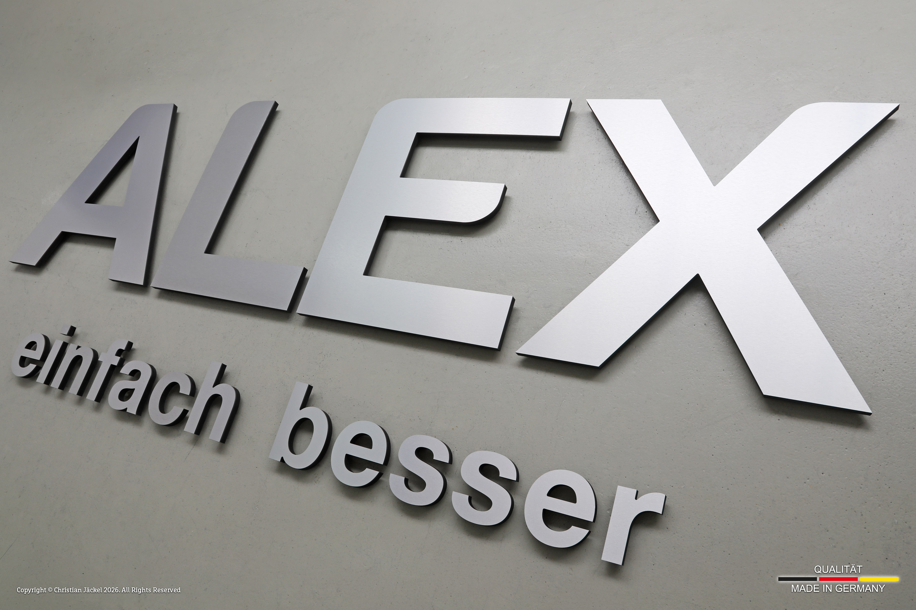 3D Buchstaben und Logos aus Aluverbundmaterial Butlerfinish gebürstet mit hinterlegtem Acrylglas oder PVC