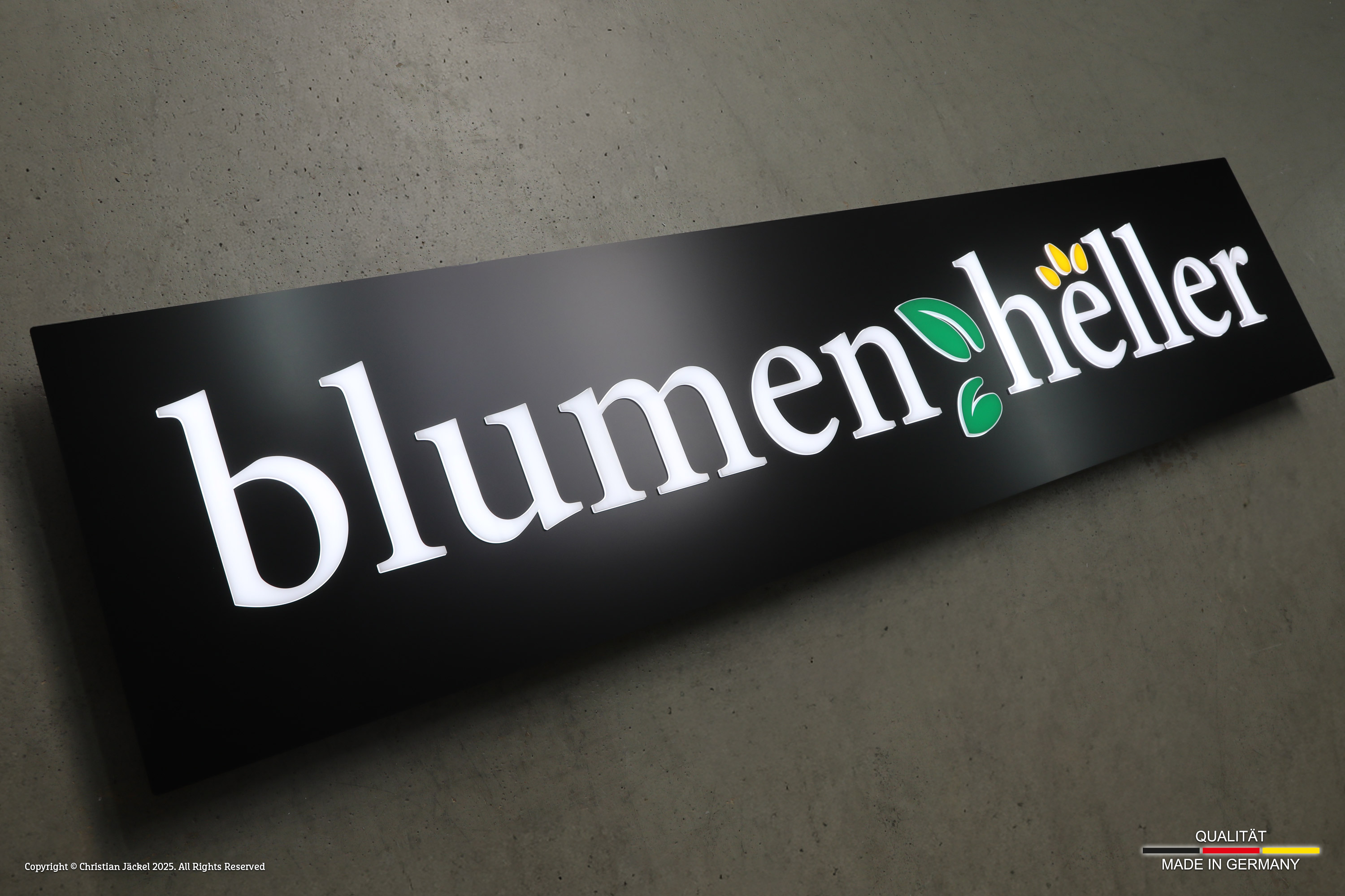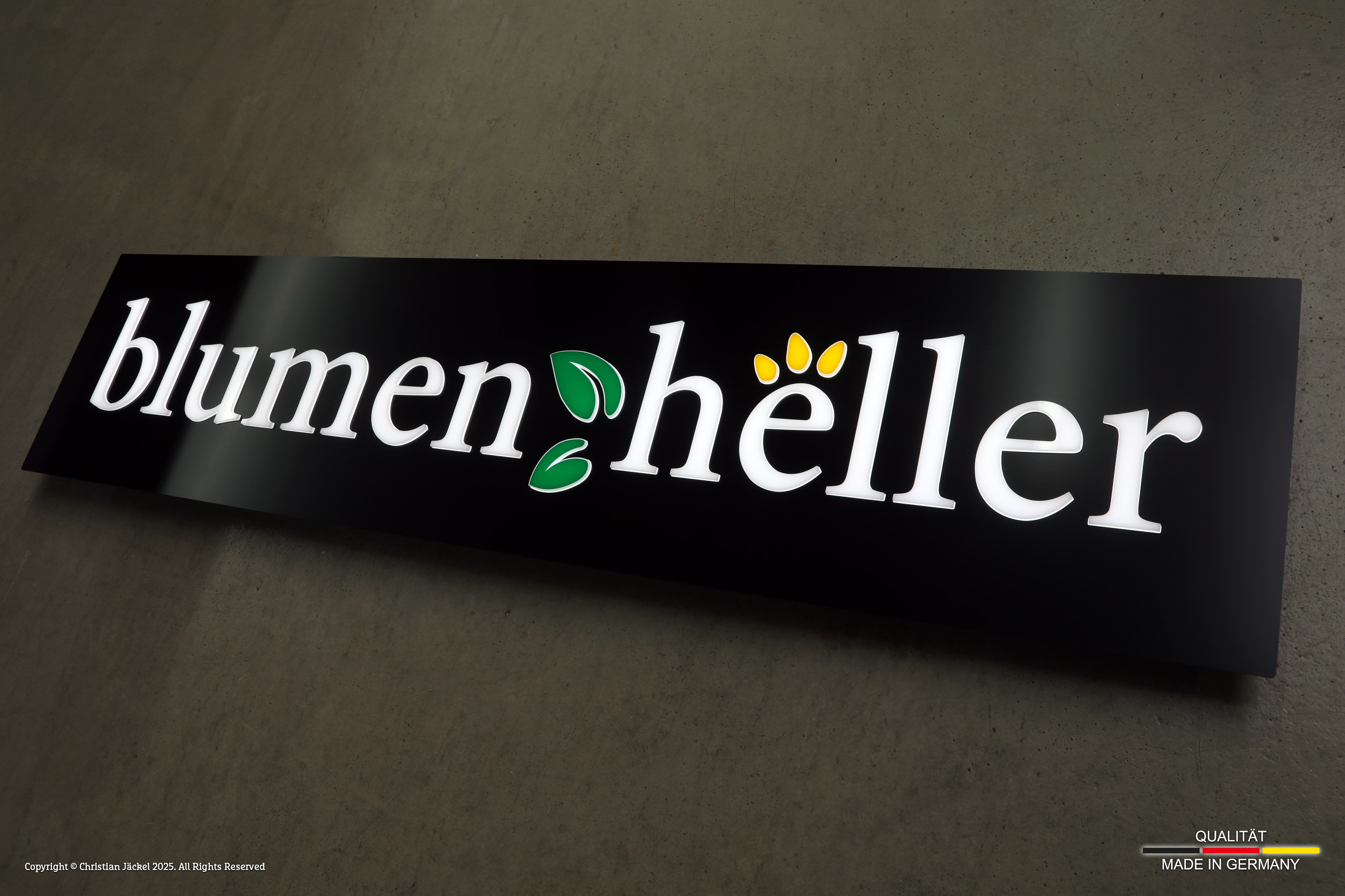 Unsere dekupierten LED-Schildkästen mit durchgestecktem, opalen Acrylglas sind eine Eigenentwicklung der Firma Jäckel Buchstaben und werden in dieser Form nur von uns gefertigt. Die besonders flache Bauweise gibt dieser Leuchtreklame einen ganz besonderen Charme und wirkt wie ein schwebendes Schild mit extrem flachen Leuchtbuchstaben.