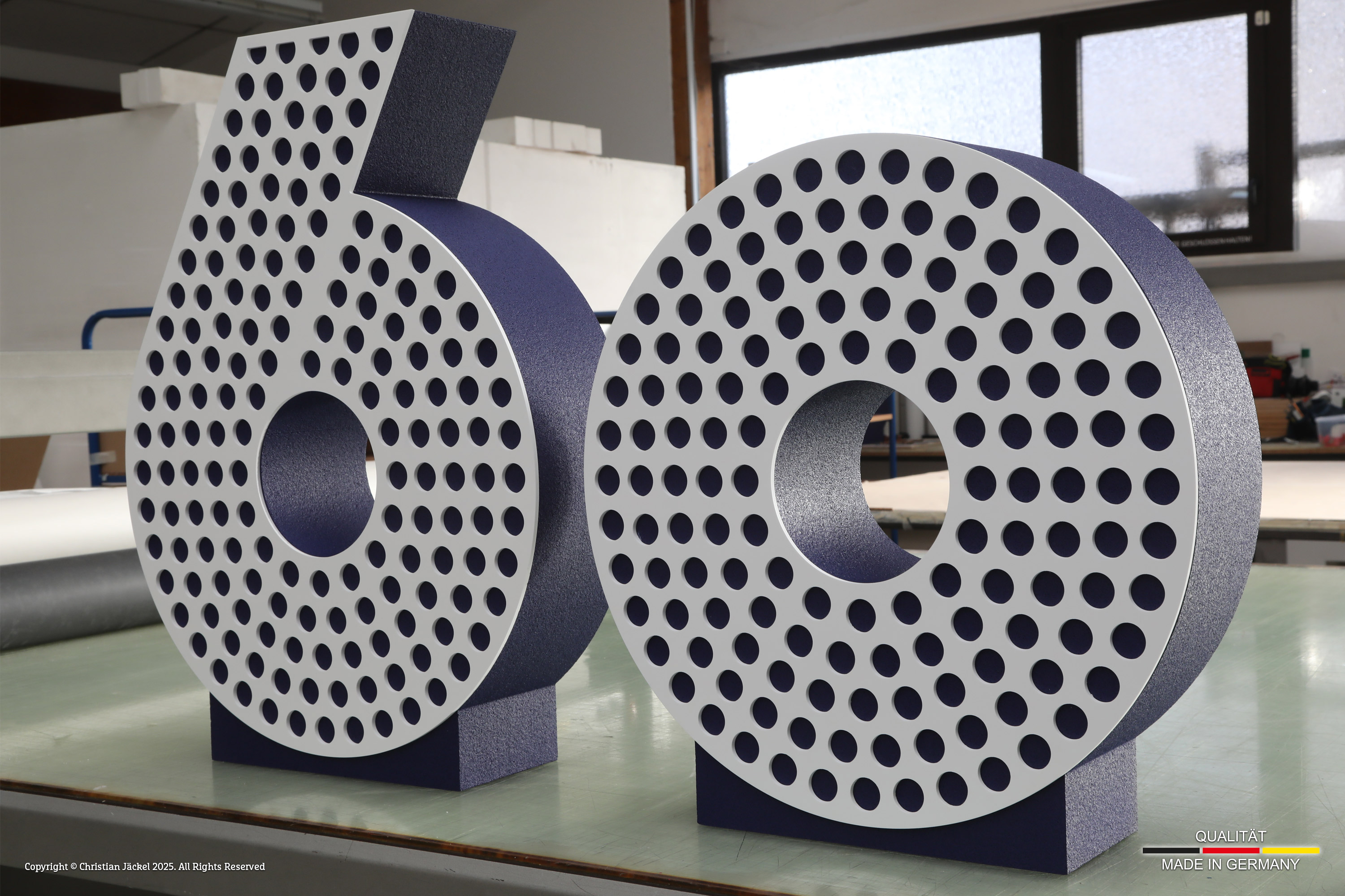 Unsere Styroporbuchstaben und Logos werden standardmäßig immer mit monolithischem Schnitt gefertigt. Durch diese relativ aufwendige Produktionstechnik werden Ein- und Ausfahrten des Heißdrahtes vermieden und die Buchstaben/Logos wirken deutlich hochwertiger.