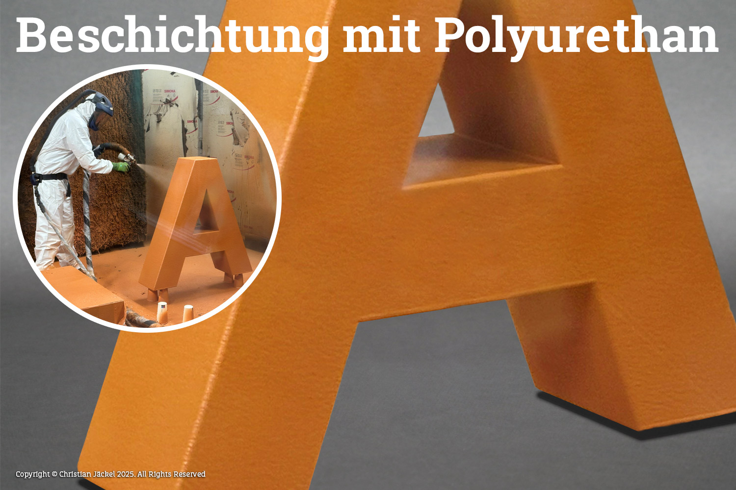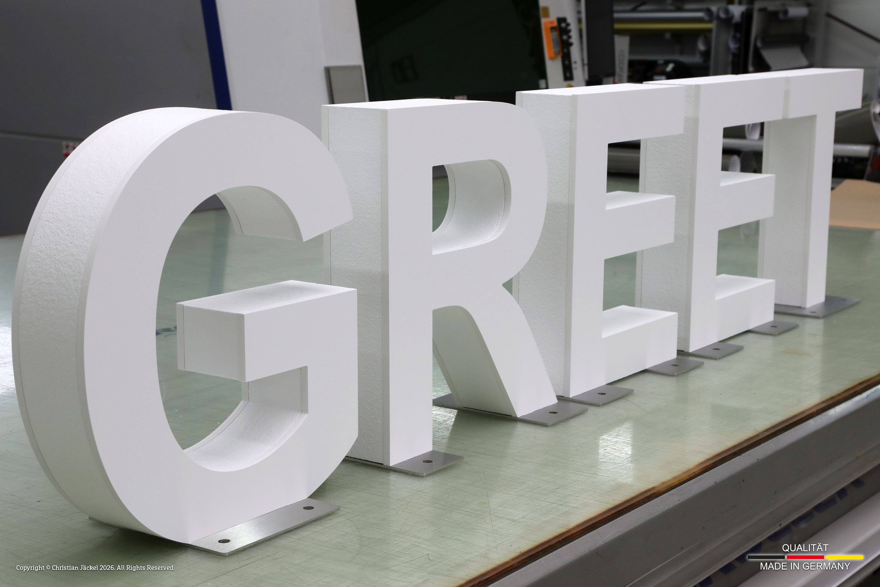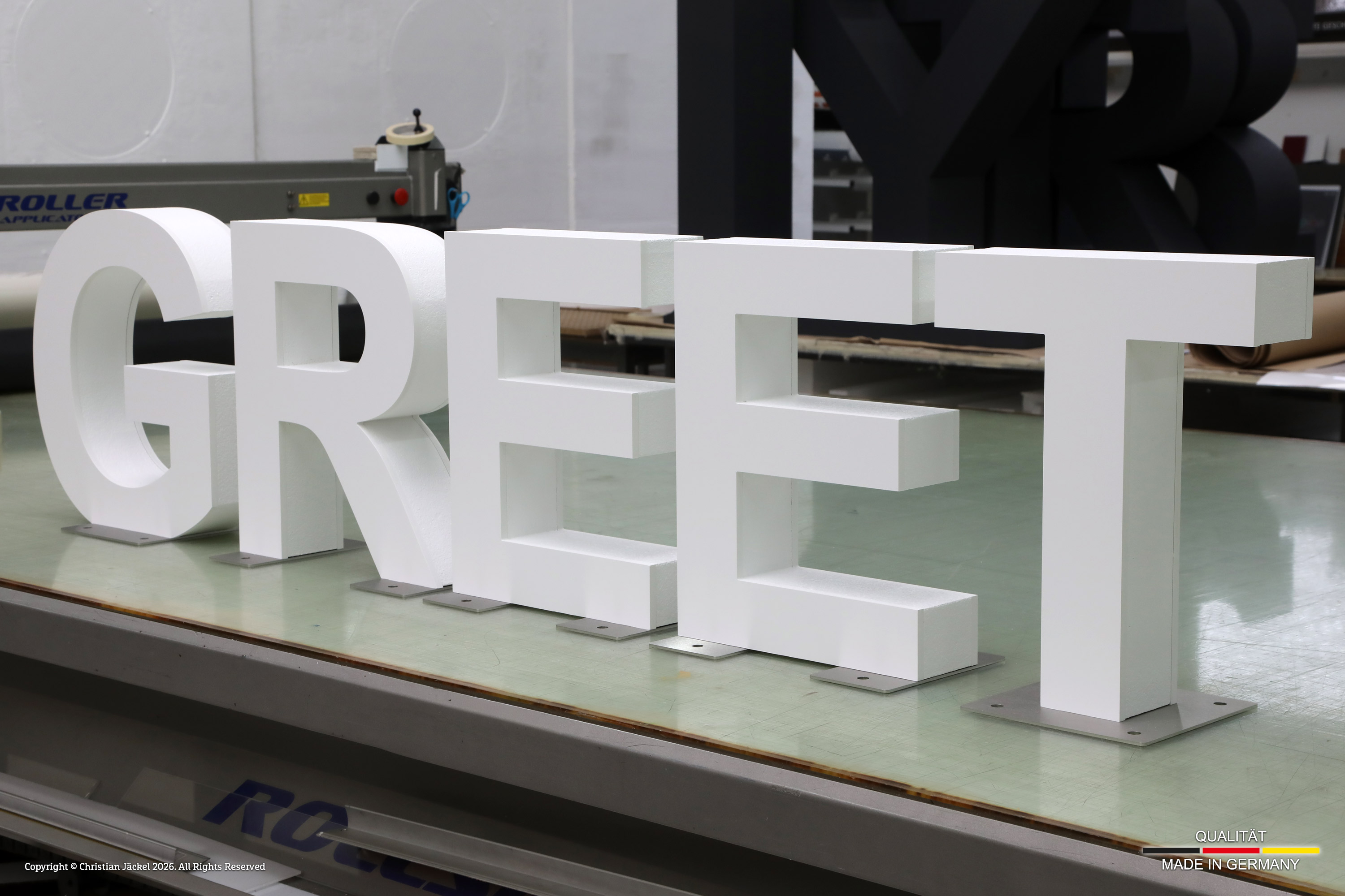 Für eine bruch- und schlagfeste Ausführung können unsere Buchstaben auch mit Polyurethan beschichtet werden. Dadurch werden die Buchstaben extrem robust und widerstandsfähig. Die Polyurethanbeschichtung wird aufgesprüht und trocknet innerhalb weniger Minuten. Dadurch lassen sich unebene Flächen und wellenbildungen nicht ausschließen. Die Oberfläche der beschichteten Buchstaben gleicht also eher einer Sichtbetonoptik. Gerade die Innenkerne der Buchstaben erhalten dadurch eine raue und ungleichmäßigere Oberfläche.