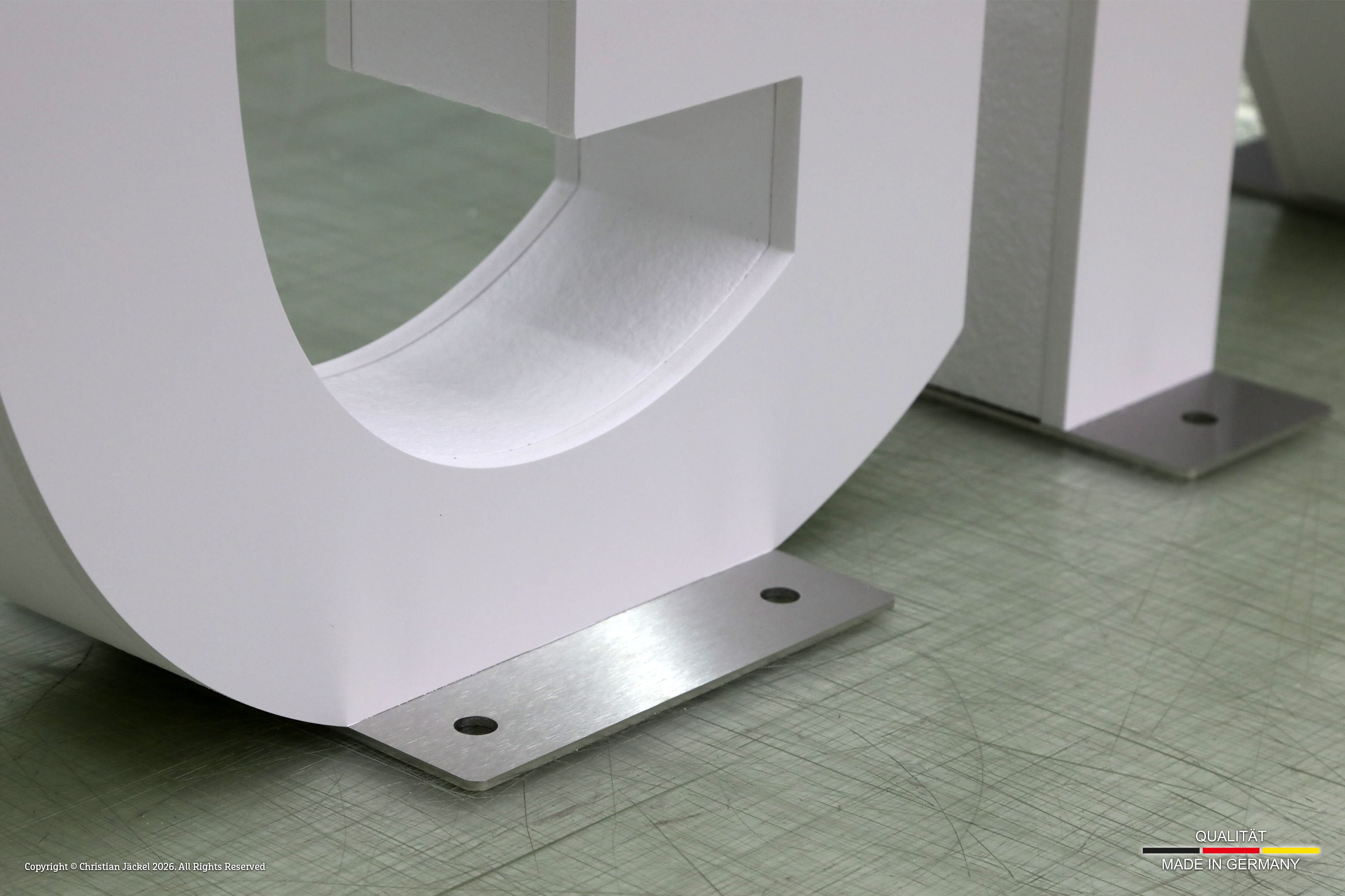Um einen noch besseren Stand gewährleisten zu können, rüsten wir die freistehenden Buchstaben auf Wunsch mit Sockelplatten (Standfüssen) aus. Diese können aus verschiedenen Materialien gefertigt werden. Hochwertige Klettbänder von 3M ermöglichen einen schnellen Aufbau der Buchstaben und sorgen für einen guten Verbund zwischen Buchstabe und Sockel.